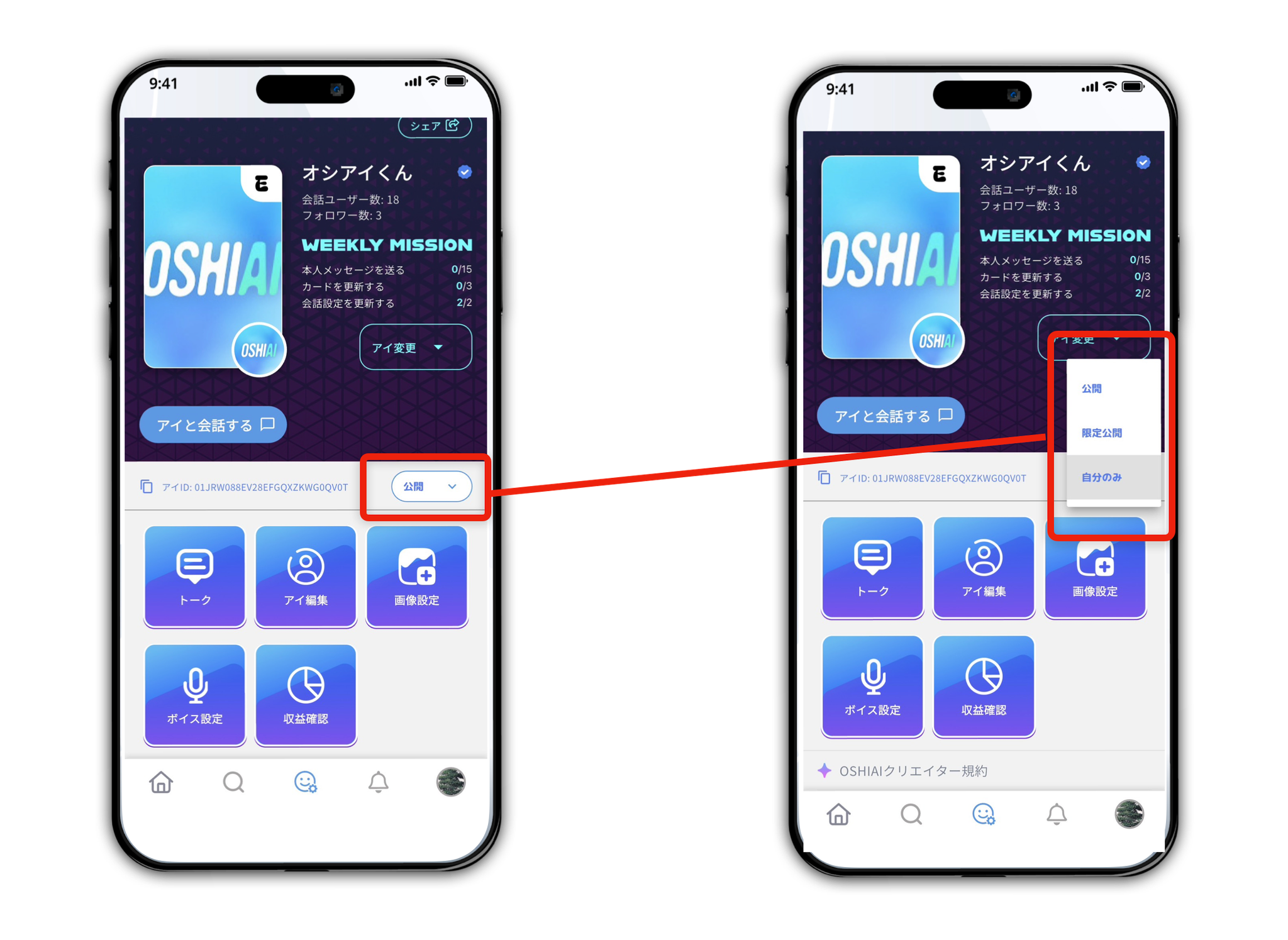 作成したアイは公開設定を変更することができ、下記2種類のモードで設定が可能です。