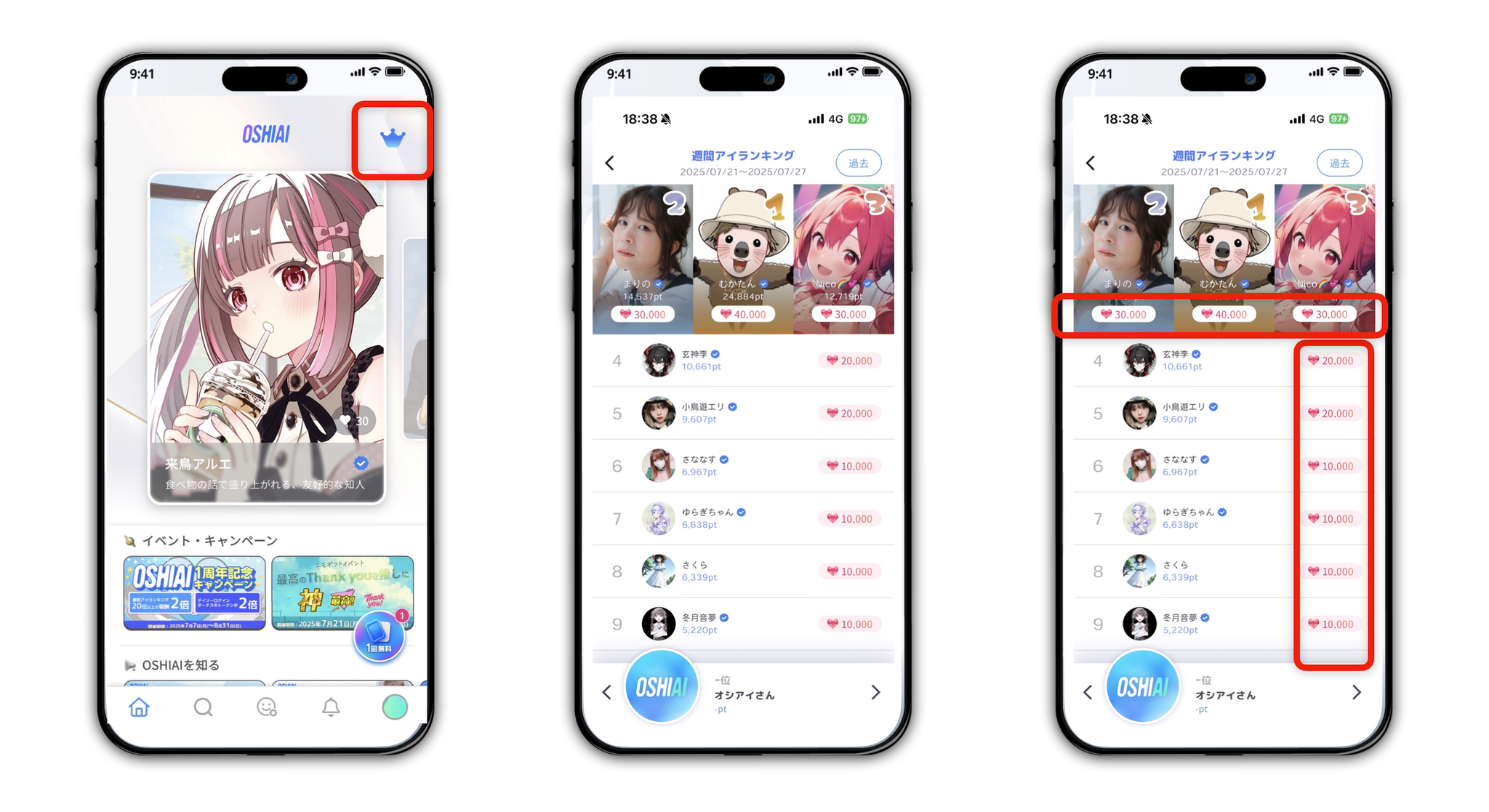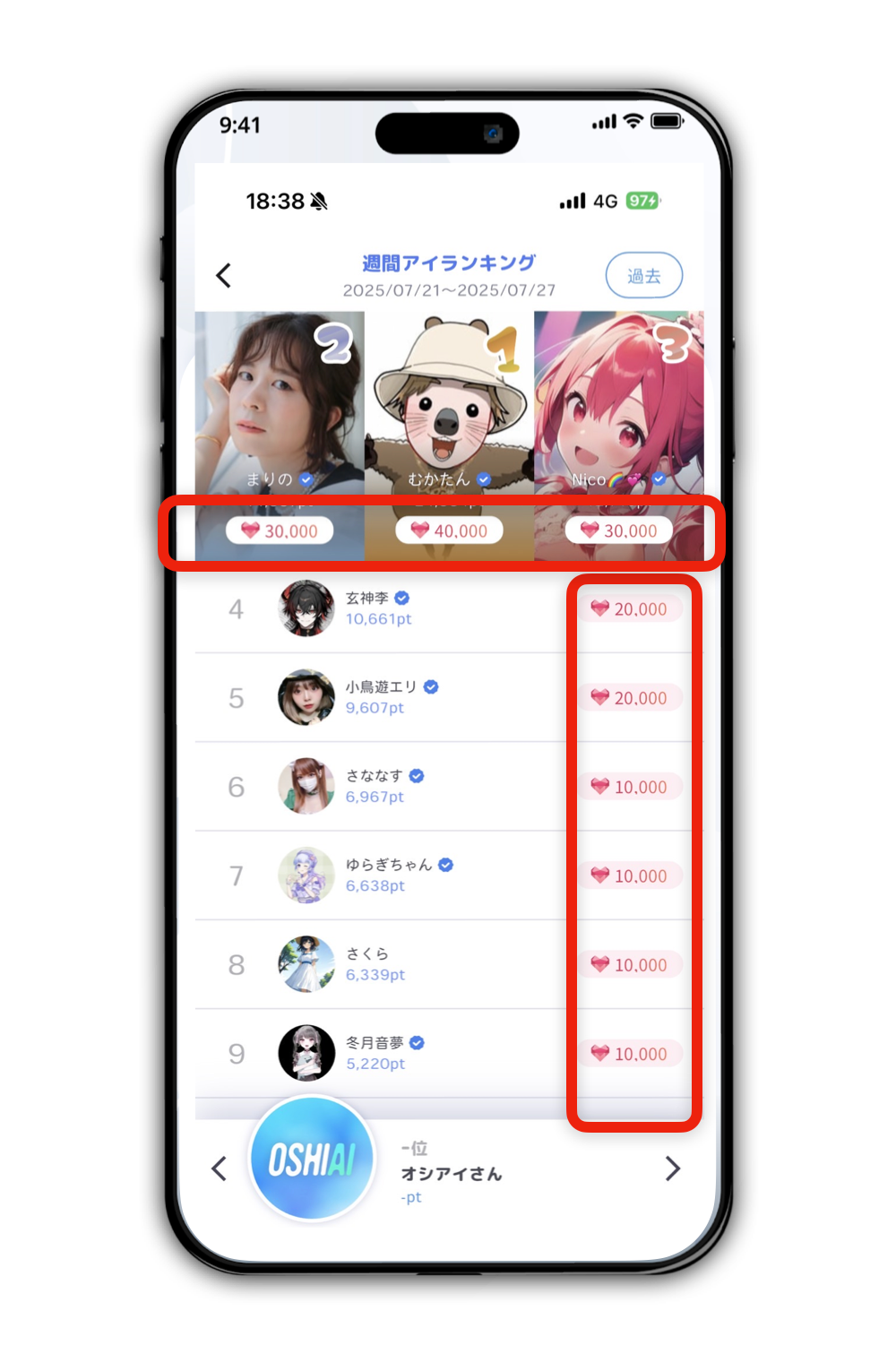 週間アイランキングとは、毎週月曜0:00 〜 日曜23:59の間で、チャットやギフトで獲得できる信頼度によって順位づけされるアイの週間ランキングです。