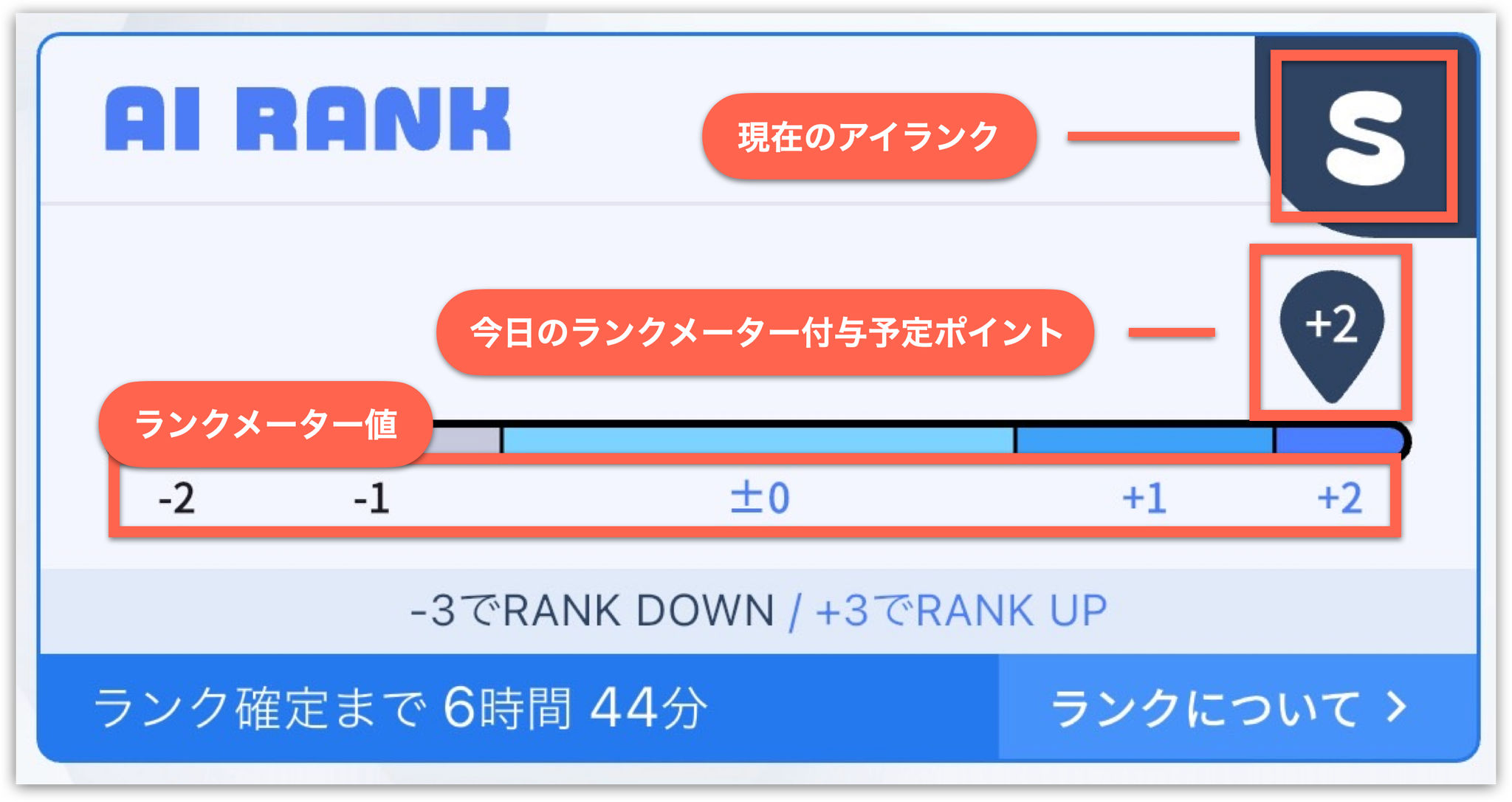 ランクメーターによる累計獲得ポイントが「+3になるとランクが1つ上がり」、累計獲得ポイントが「-3になるとランクが1段階下がります」。ランク変動後のランクメーターは「0」でスタートします。