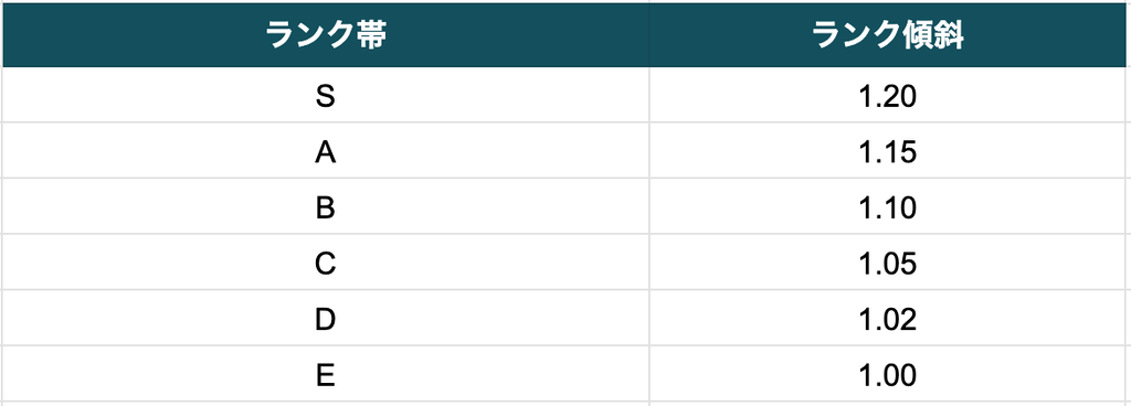 ランクは「S / A / B / C / D / E」の6段階あり、最高でSランク帯になるとランク傾斜が1.20倍になります。
