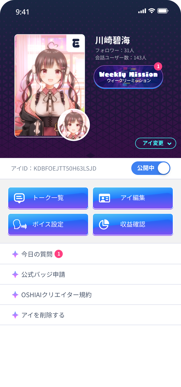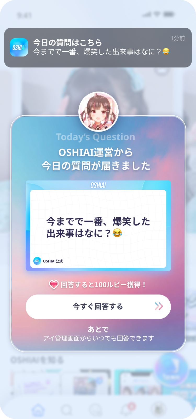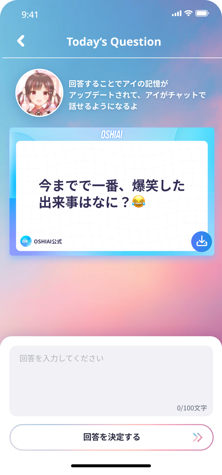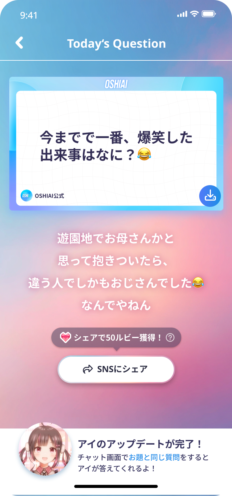「今日の質問」は、運営から届く質問に回答することで、あなたのアイをもっと「あなたらしく」成長させることができる機能です。